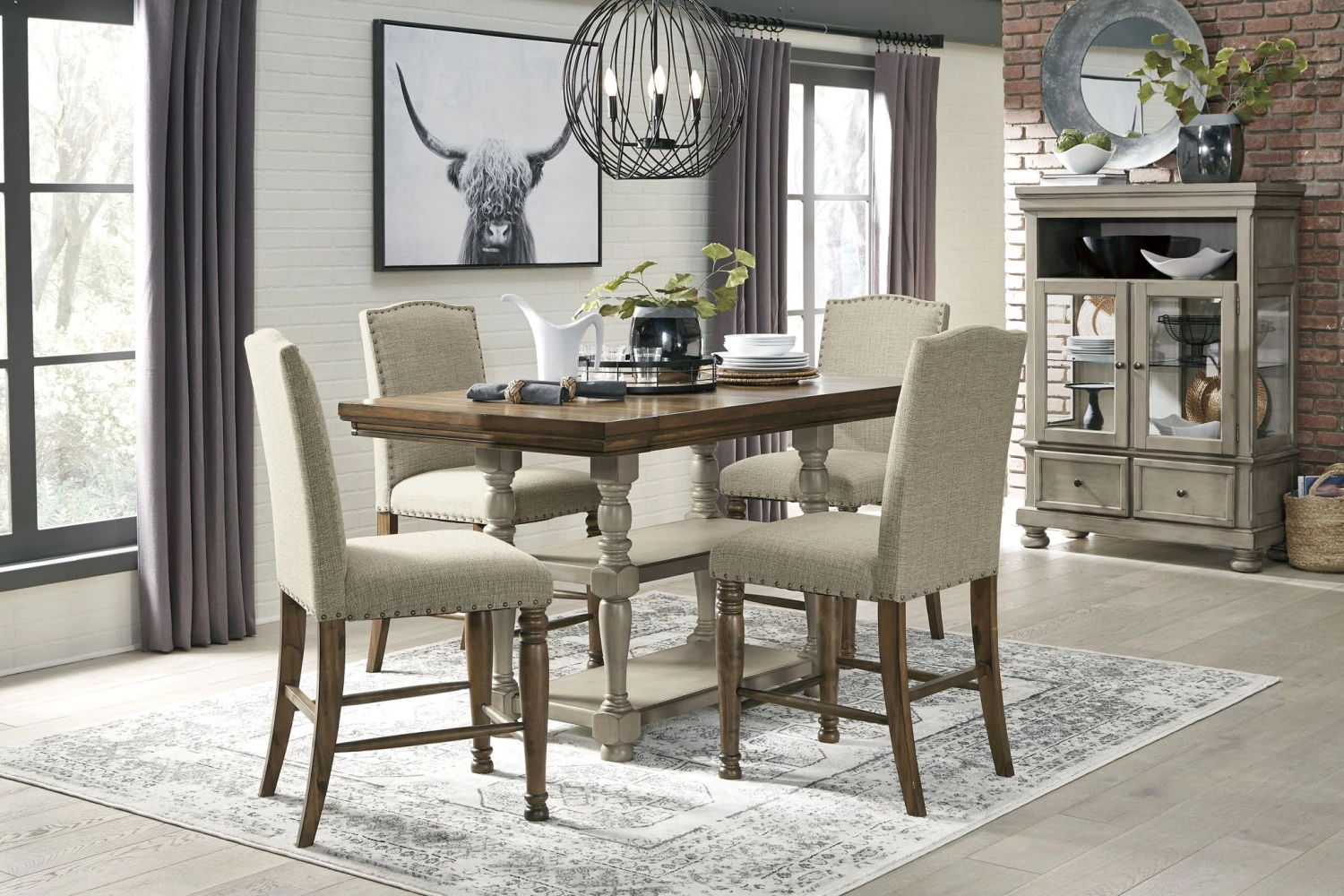 Casual styling with a traditional look. Table is made with hardwood solids, engineered wood and Acacia veneers. Two-tone finish featuring our B733 burnished light gray with D719 light brown wood tone. Gathering height table features two extension leaves for additional dining space. Stylish upholstered back stools and matching bench with an oatmeal colored woven polyester fabric set with nail head trim. Curio china with two lower drawers, double glass doors and a large open display shelf. Made with birch veneers and hardwood solids. D733-223 table is made with hardwood solids, engineered wood and acacia veneers. Two-tone finish featuring a burnished light gray and light brown wood tone. Four woven baskets are provided for ample storage. Casual styling with a traditional look. D733-223 stool dimension: 15″W x 15″D x 24″H.