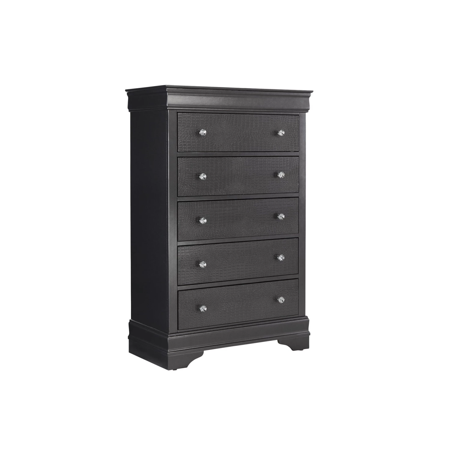 Your sleeping space should dazzle with the Pompei Chest, featuring spacious drawers, crystal inspired hardware, and textured detail. This chest is sure to provide an unexpected luxe look and feel in your bedroom.
