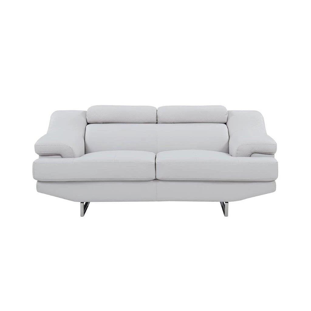 Anyone who visits your home will be inspired and impressed by this stylish and uniquely shaped futuristic loveseat. Its light gray upholstery features clean lines and subtle diamond quilt accent stitching, creating an opulent flare. Offsetting this stylish piece is a front-to-back chrome accent base that adds a glamorous sparkle that makes this bold piece appear like itâs floating.