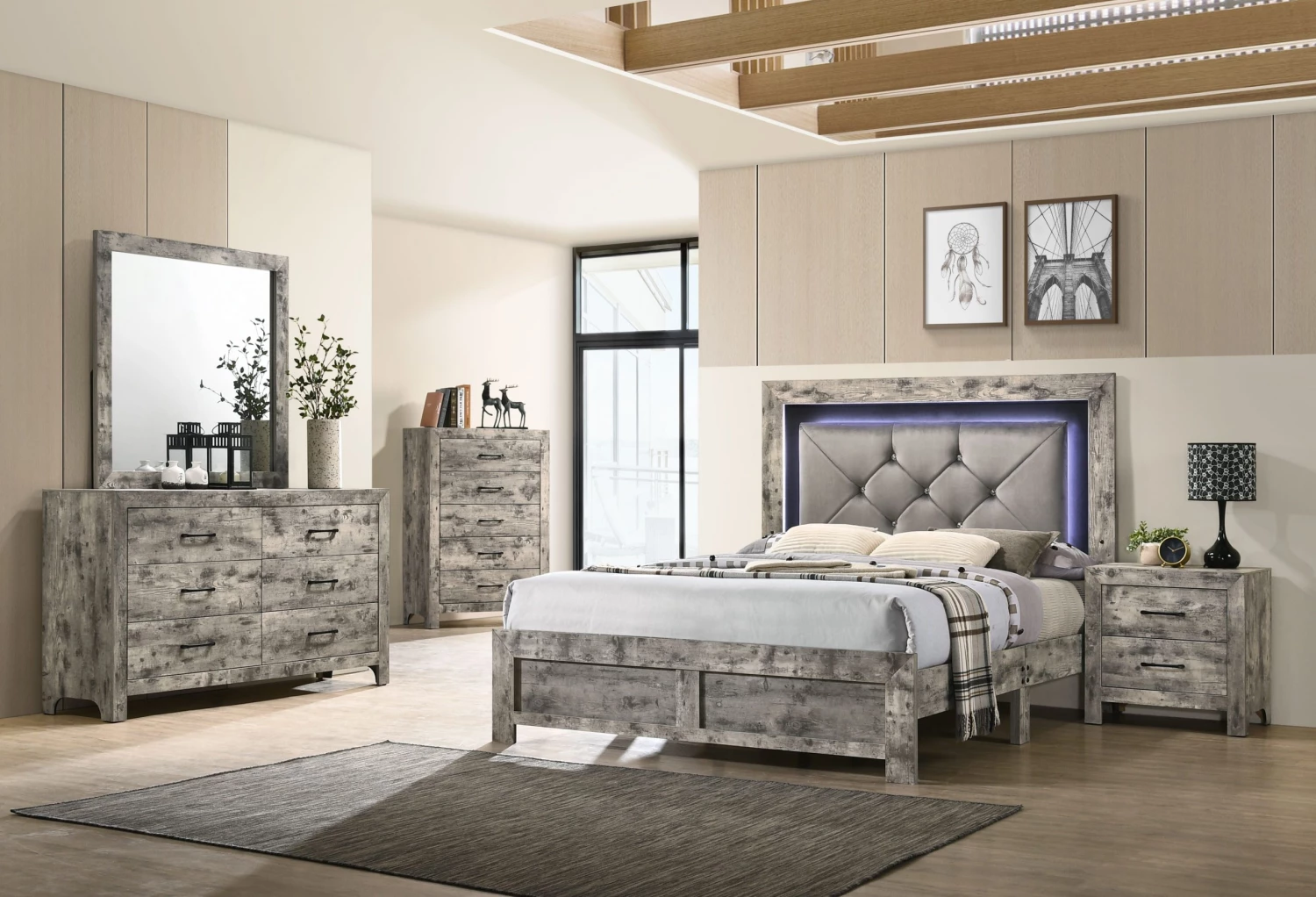 This set includes Queen Bed, Dresser with Mirror and Nightstand.